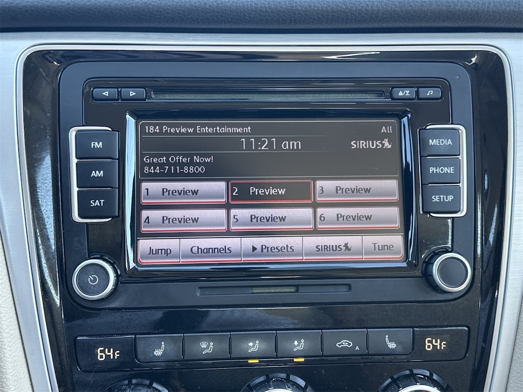 Beige Premium Synthetic, 17" Sonoma Alloy Wheels, 4-Wheel Disc Brakes, 8 Speakers, ABS brakes, Air Conditioning, Alloy wheels, AM/FM radio: SiriusXM, Auto-dimming Rear-View mirror, Automatic temperature control, Brake assist, Bumpers: body-color, CD player, Compass, Delay-off headlights, Driver door bin, Driver vanity mirror, Dual front impact airbags, Dual front side impact airbags, Electronic Stability Control, First Aid Kit, Four wheel independent suspension, Front anti-roll bar, Front Bucket Seats, Front Center Armrest, Front dual zone A/C, Front reading lights, Fully automatic headlights, Heatable Front Bucket Seats, Heated door mirrors, Heated front seats, Illuminated entry, Leather Shift Knob, Leather steering wheel, Low tire pressure warning, Occupant sensing airbag, Outside temperature display, Overhead airbag, Overhead console, Panic alarm, Passat Mat Kit, Passat Security Wheel Locks (Set of 4), Passenger door bin, Passenger vanity mirror, Power door mirrors, Power driver seat, Power moonroof, Power steering, Power windows, Radio data system, Radio: Premium 8 Touch-Screen w/6-CD Changer, Rear anti-roll bar, Rear reading lights, Rear seat center armrest, Rear window defroster, Remote keyless entry, Speed control, Speed-sensing steering, Split folding rear seat, Steering wheel mounted audio controls, Tachometer, Telescoping steering wheel, Tilt steering wheel, Traction control, Trip computer, Turn signal indicator mirrors, V-Tex Leatherette Seating Surfaces, and Variably intermittent wipers.